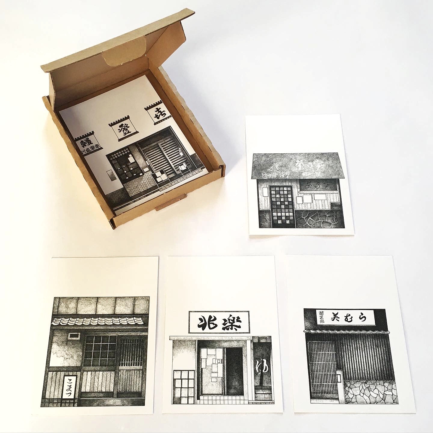 Quattro dipinti: ciascuno un delicato assortimento di tratti a penna, pittura bianca, ombre e